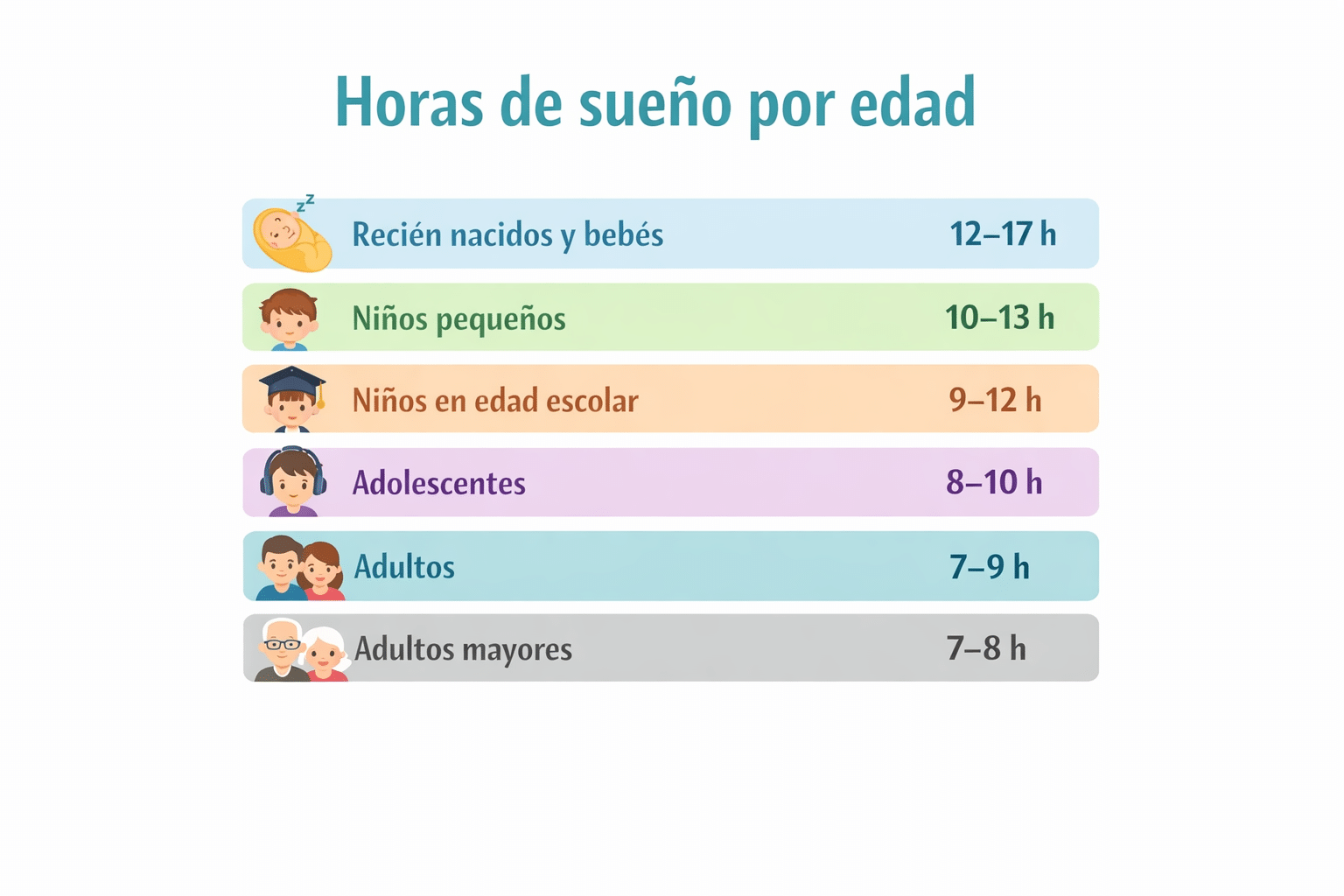 El rango recomendado es 7–9 horas. Sin embargo, la variabilidad individual aumenta.